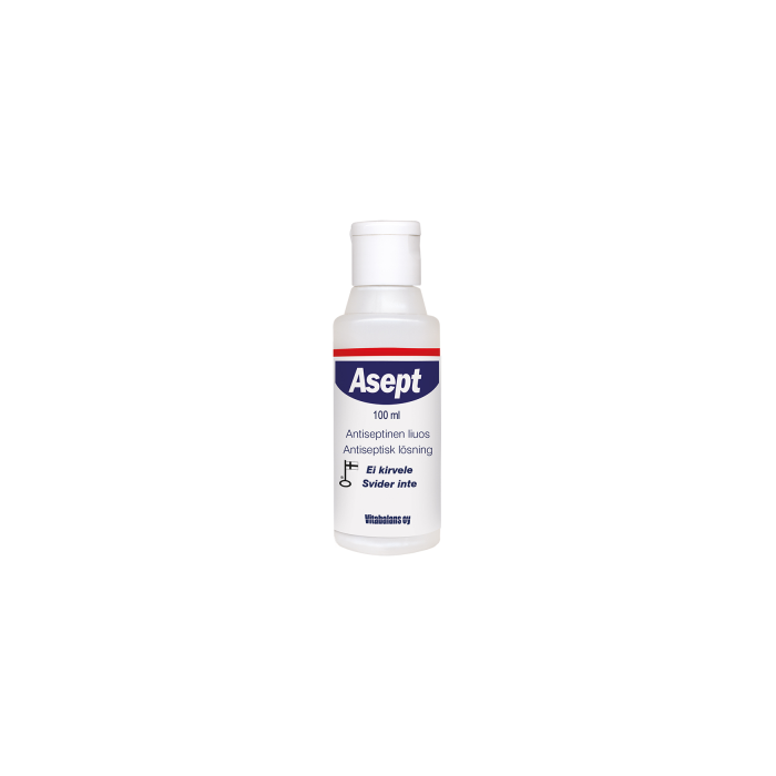 Asept puhdistaa ja desinfioi pienet haavat, naarmut sekä ihovauriot. Antiseptinen liuos sopii myös hyönteisten puremien ja auringon polttaman ihon puhdistukseen.  Asept on miellyttävä käyttää, sillä se ei kirvele iholla. Sopii koko perheelle.