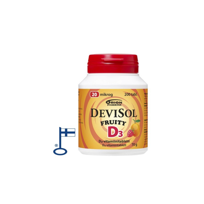 DeviSol Fruity on ihanan hedelmäinen, persikan ja vadelman makuinen D3-vitamiinitabletti. Helposti suussa hajoava purutabletti hajoaa helposti suussa ja se on makeutettu ksylitolilla ja sorbitolilla. Sisältää vain luonnollista persikka-ja vadelma-aromia. Laktoositon (maidoton), hiivaton, gluteeniton, sokeriton. Ei sisällä soijaa tai liivatetta.