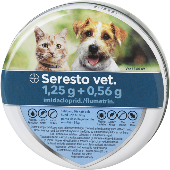 Seresto vet. harmaa, hajuton panta (38 cm, 12,5 g) sisältää vaikuttavana aineena 1,25 g imidaklopridia ja 0,56 g flumetriinia. Valmistetta käytetään koirien ja kissojen kirpputartuntojen hoitoon ja ennaltaehkäisyyn sekä koirille väivetartuntojen hoitoon. Valmisteella on koirille ja kissoille 8 kuukautta kestävä puutiaisia tappava vaikutus tai puutiaisia karkottava vaikutus puutiaislajista riippuen (katso pakkauselosteesta tarkemmat tiedot). Ei alle 7 viikon ikäisille koiranpennuille eikä alle 10 viikon ikäisille kissanpennuille.