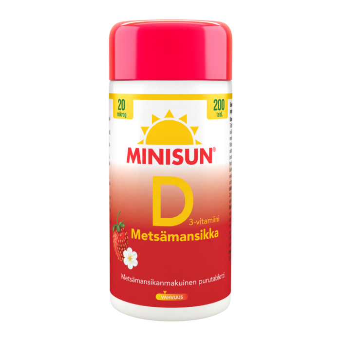 Minisun Metsämansikka 20 mikrog. passar för daglig användning för barn i skolåldern och för vuxna.