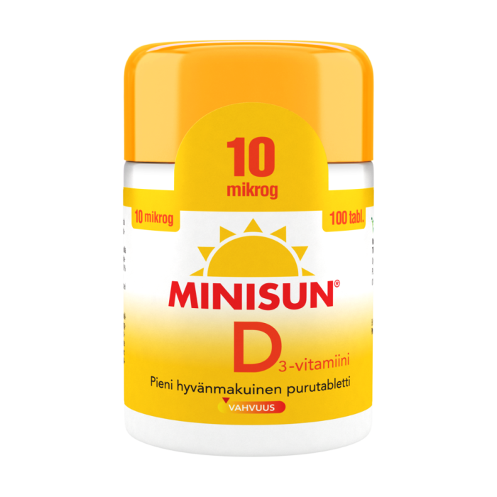 Minisun D-vitamintabletterna har utvecklats i Finland och lämpar sig för hela familjen. Minisun 10 mikrog tuggtabletter är en välsmakande favorit bland både vuxna och barn. Ett enkelt sätt att trygga det dagliga behovet av vitamin D året om. Minisun innehåller vitamin D3 som effektivt tas upp i kroppen. Vitamin D förstärker motståndskraften och är ett viktigt vitamin för välmående benstomme, muskler och tänder. Tabletterna är sötade med xylitol och de fungerar både som sug- och tuggtabletter, som vanliga tabletter att svälja, samt i krossat format. Produkten är fri från laktos, gluten, jäst, soja och gelatin. Dosering: 1 tuggtablett dagligen. Tabletten kan tuggas, sugas eller sväljas. Innehåll: En tablett innehåller: D3-vitamin (kolekalciferol) 10 mikrog (400 IU), 200 % av referensvärdet. Förteckning över ingredienser: Sötningsmedel (sorbitol, xylitol), klumpförebyggande medel (magnesiumsalter av fettsyror), D3-vitamin (kolekalciferol). Innehåller sötningsmedel. Överdriven konsumti